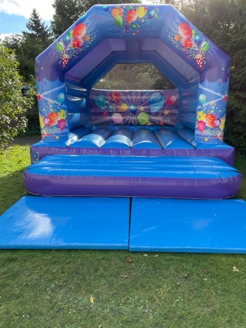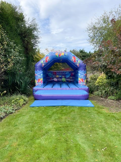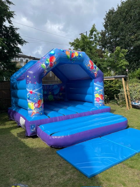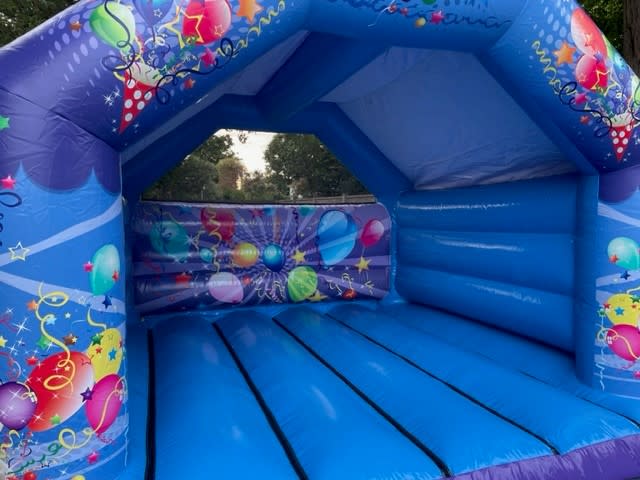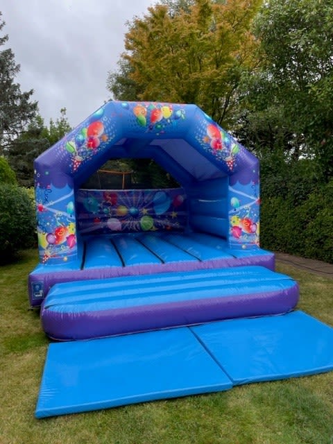 Our A-Frame medium size Celebration Party Bouncer measures 12ft x 15ft, providing plenty of room for kids to jump, play, and have a blast. With its vibrant blue and purple colors, Louie the Bluey is sure to capture the attention and excitement of party-goers of all ages.